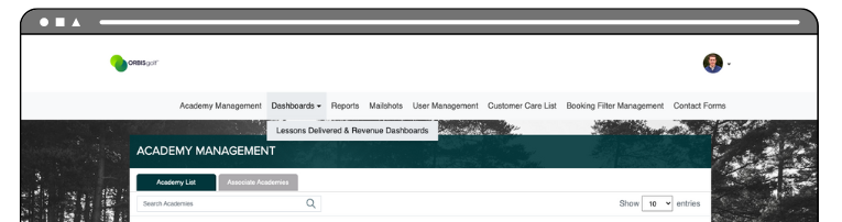 Owner space users can access the Dashboards via the Dashboards menu navigation and selecting the Lesson Delivered & Revenue Dashboards sub-menu option:
