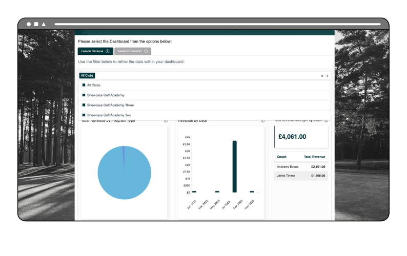 - Lesson Revenue Dashboard – Track revenue by lesson type, program, coach, and student membership status.